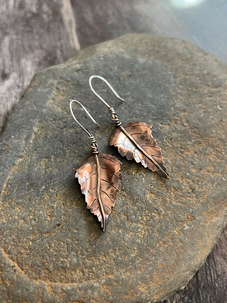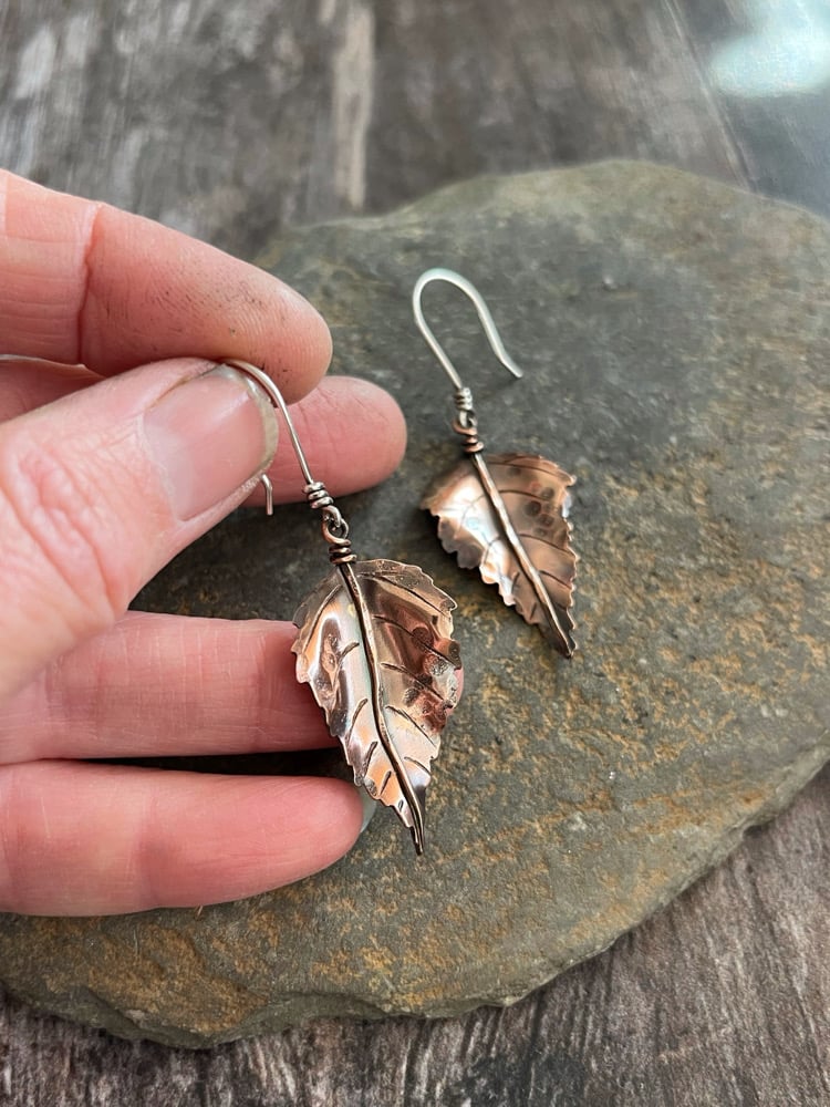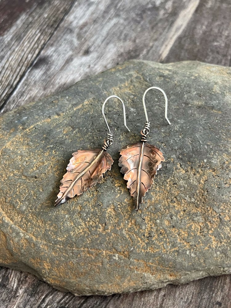 Hand crafted copper Birch leaves hung on sterling silver ear wires.
