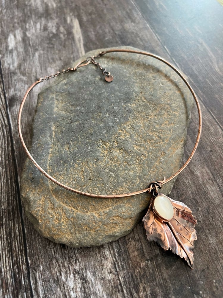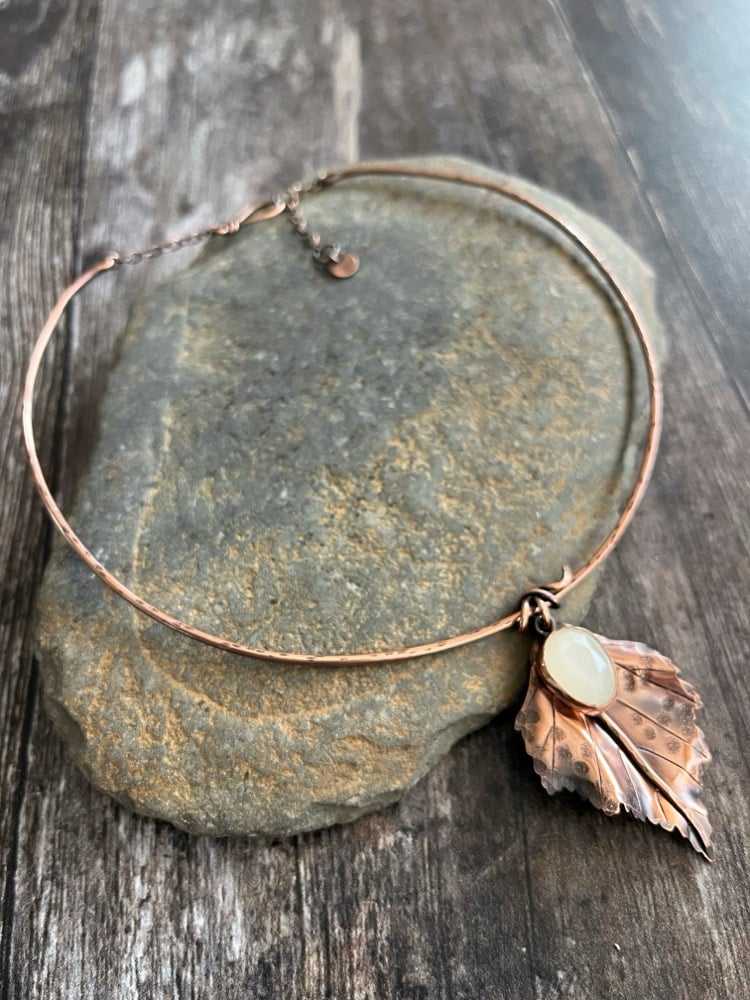 A copper necklace decorated with a handcrafted Birch leaf and a beautiful rose cut white Moonstone.