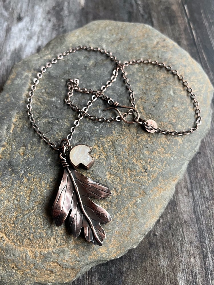 Handcrafted from copper with a rainbow moonstone toadstool cabochon, threaded onto a copper chain.
