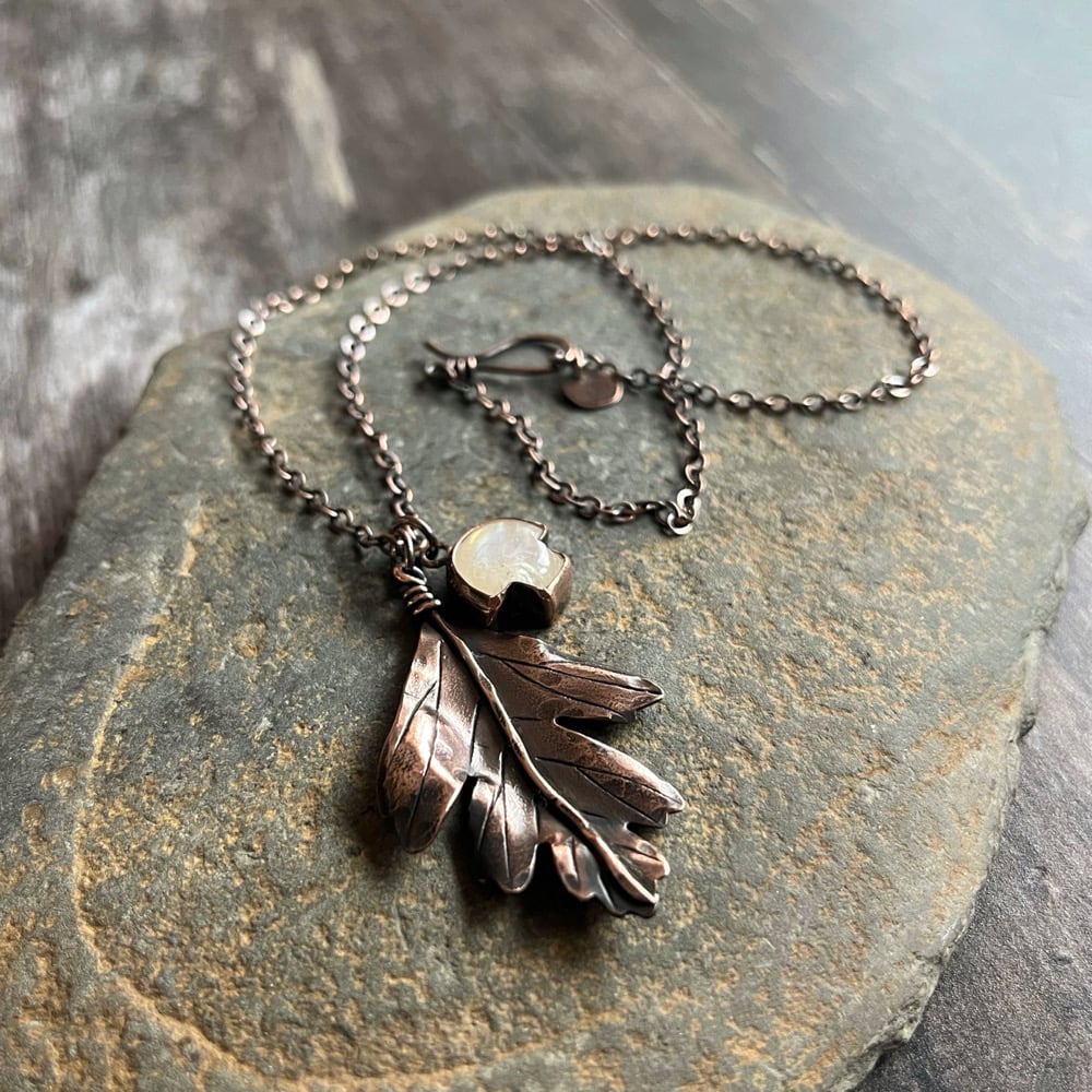 A handcrafted Hawthorn leaf, the tree of enchantment and a tiny sparkling toadstool from a fairy ring. This one is a rainbow moonstone, so a little lunar magic too.