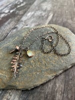 A handcrafted copper Fern, a toadstool and a rose cut Moss Aquamarine. Threaded onto a 17" copper chain which fastens with a hook clasp.