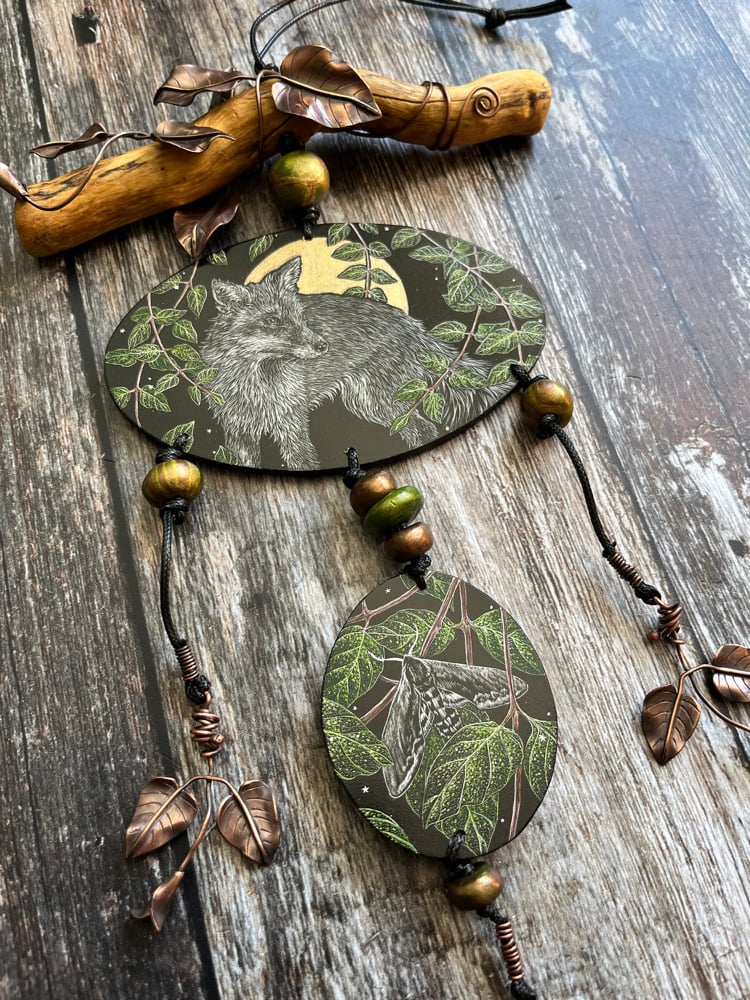 This wallhanging has been etched onto Ampersand Scratchboard, then coloured with inks and varnished. It has then been decorated with handmade beads, handcrafted copper leaves and driftwood gathered from my local beach.