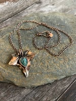 A handcrafted copper Ivy leaf, the twisted stem of which holds a faceted emerald.