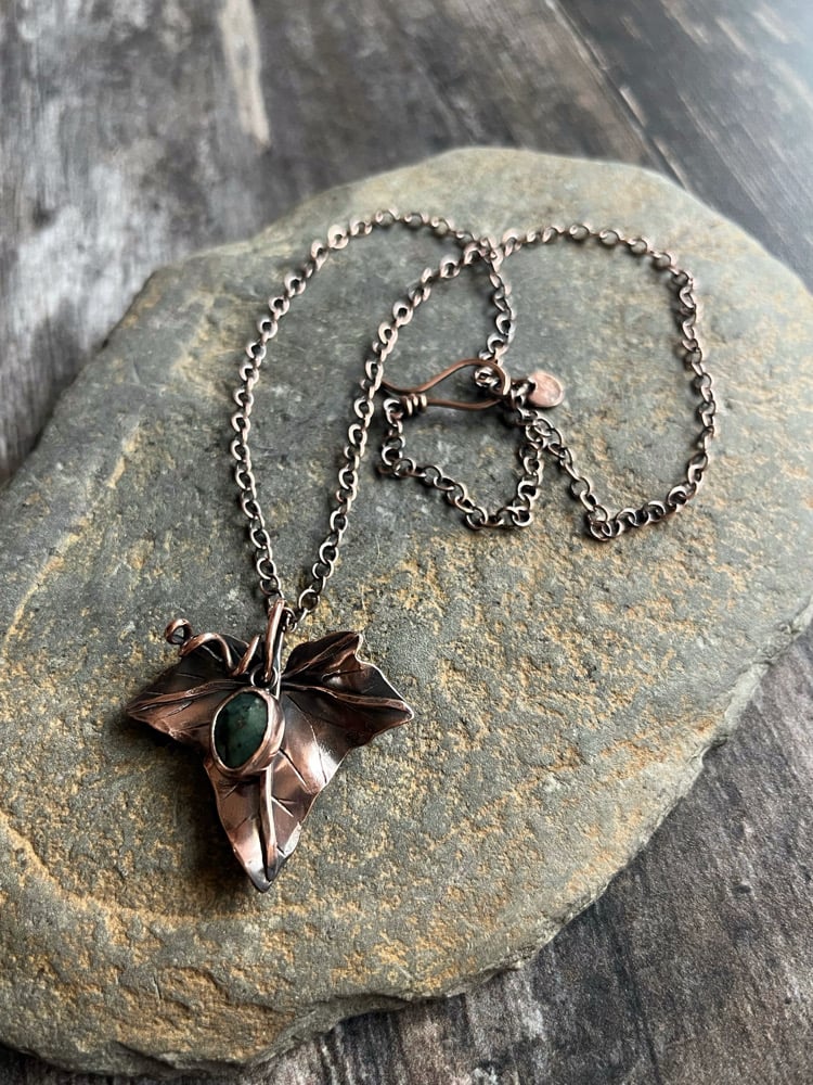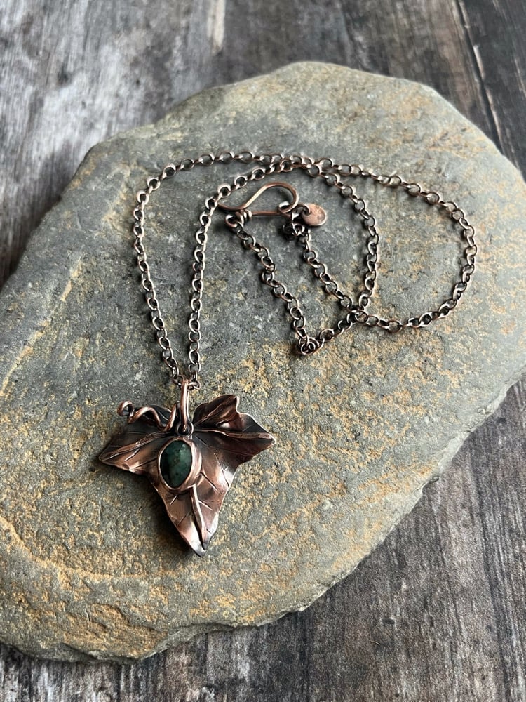A handcrafted copper Ivy leaf, the twisted stem of which holds a rose cut emerald.