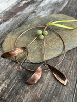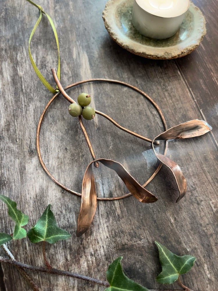 So this is my Yuletide offering. A handcrafted copper spring of Mistletoe, decorated with three Jade beads and set in a hammered copper circle to welcome the returning Sun at Midwinter. With a green ribbon for hanging.