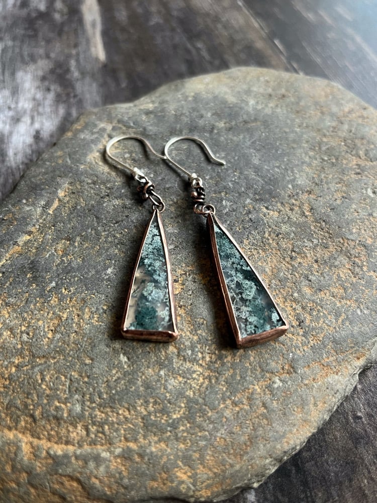 These dangles are a one off with a pair of Beautiful Moss Agate Cabochons set in copper with sterling silver ear wires.