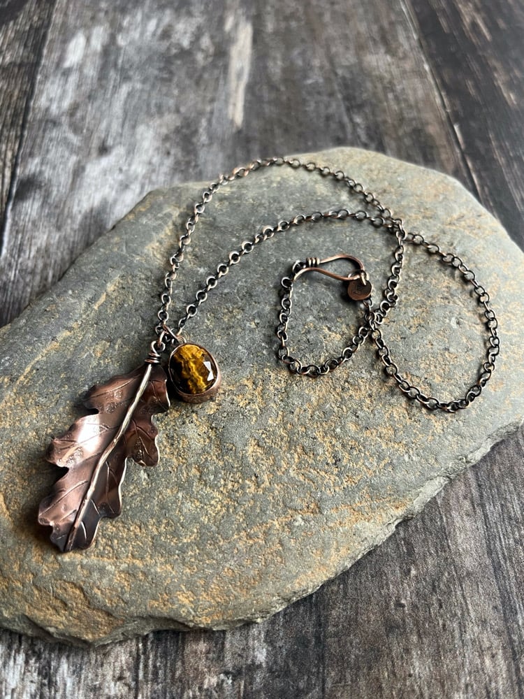 A handcrafted copper Oak leaf and a beautiful rose cut Tigers Eye threaded onto a 17" copper chain which fastens with a hook clasp.