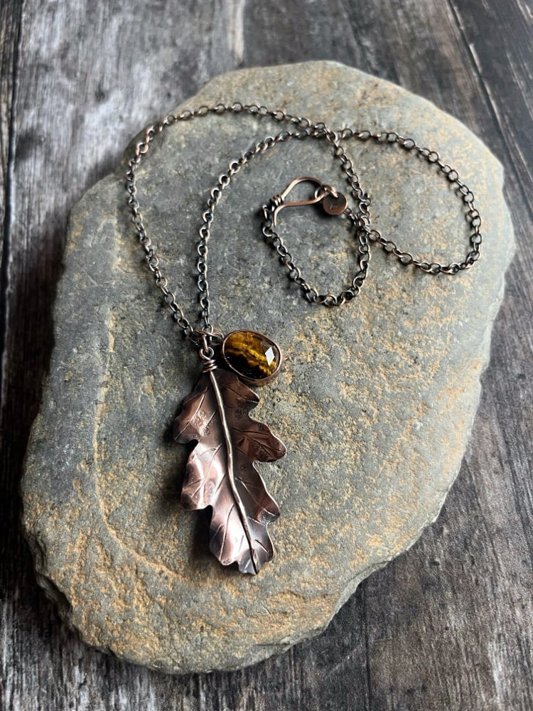 A handcrafted copper Oak leaf and a beautiful rose cut Tigers Eye threaded onto a 17" copper chain which fastens with a hook clasp.