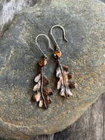 Hand crafted copper Oak leaves with rose cut Tigers Eye cabochons hung on sterling silver ear wires.