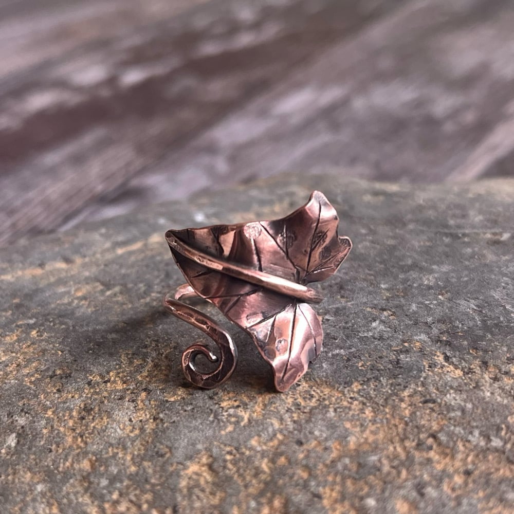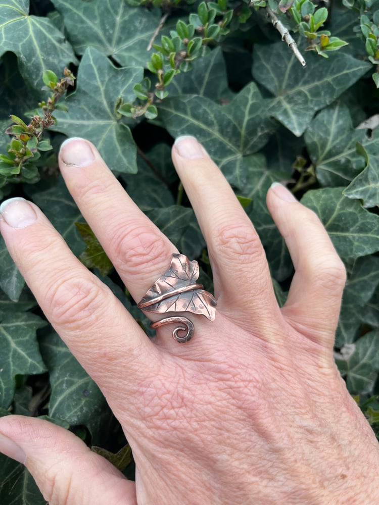 Handcrafted from copper, the Ivy leaf wraps around your finger. As this ring has an open ring band it can be adjusted to fit.